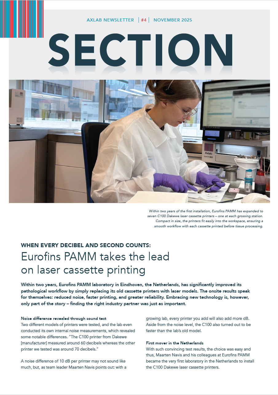 Within two years, Eurofins PAMM laboratory in Eindhoven, the Netherlands, has significantly improved its pathology workflow by simply replacing its old cassette printers with laser models. The onsite results speak for themselves: reduced noise, faster printing, and greater reliability. Embracing new technology is, however, only part of the story – finding the right industry partner was just as important.